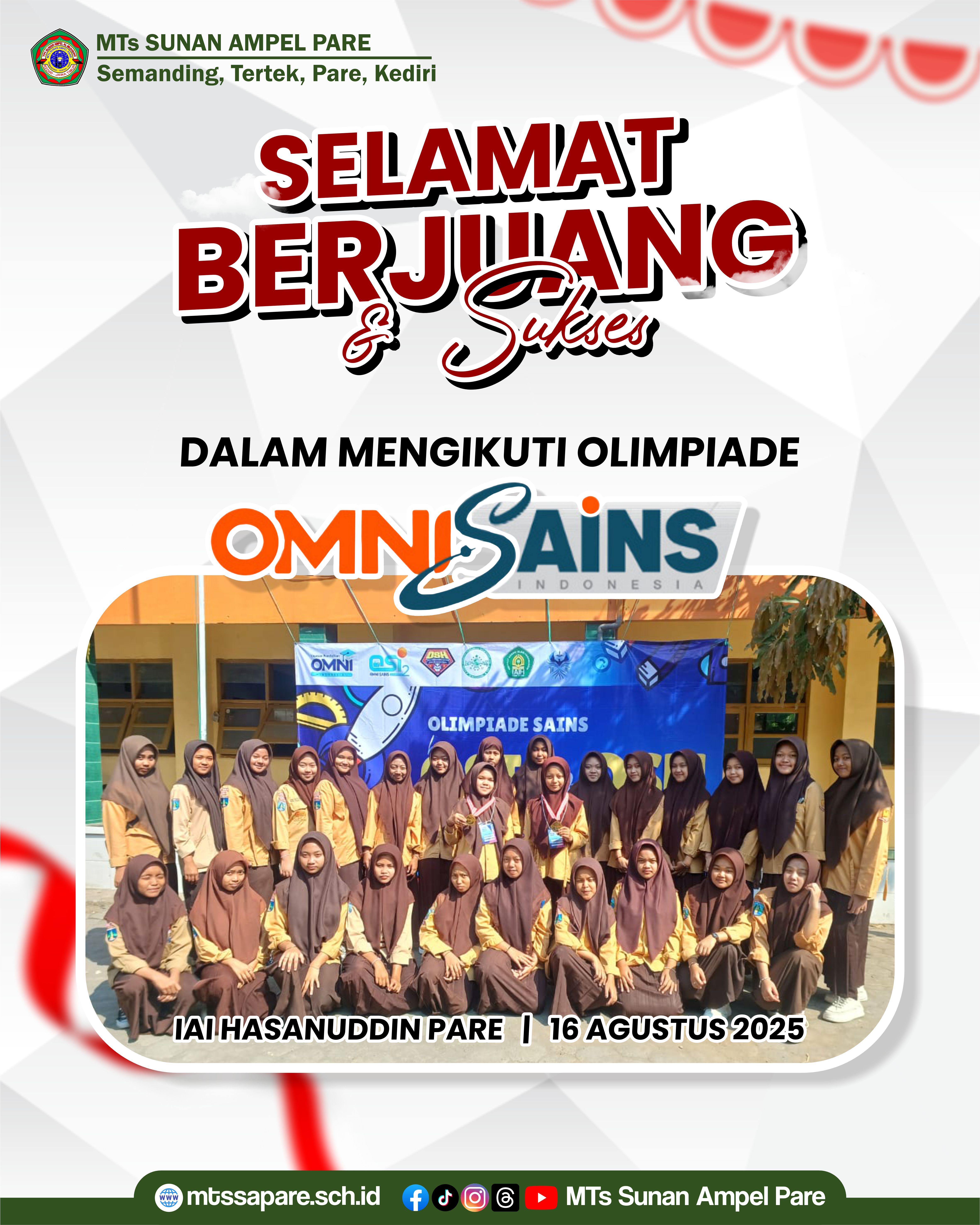Sabtu, 16 Agustus 2025 – MTs Sunan Ampel Pare kembali menunjukkan komitmennya dalam mendukung prestasi akademik siswa dengan mendelegasikan peserta didik terbaiknya untuk mengikuti ajang Olimpiade Omni Sains 2025 yang bertempat di IAI Hasanuddin Pare. Olimpiade ini merupakan kompetisi bergengsi yang menguji kemampuan siswa dalam bidang ilmu sains.