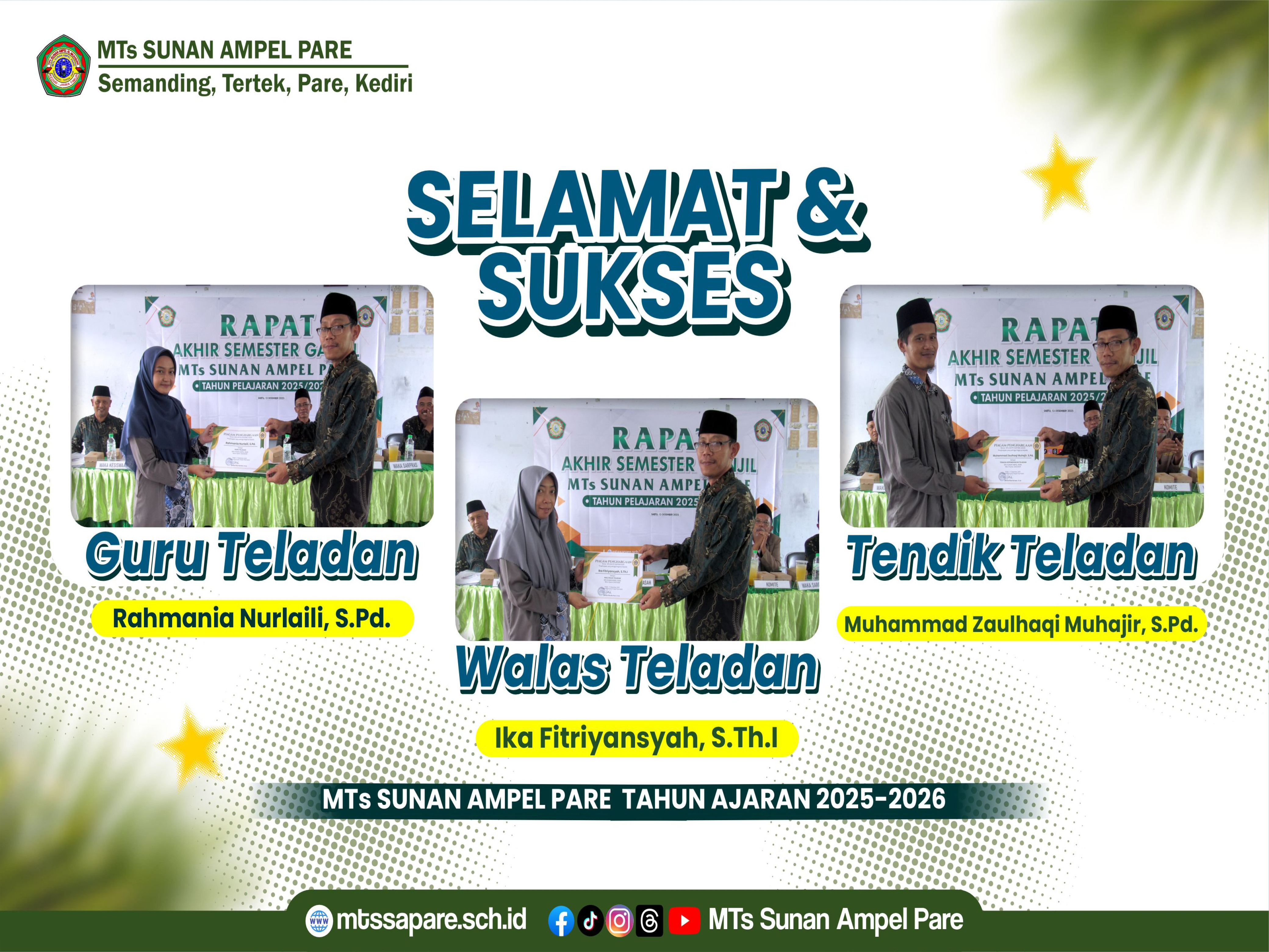 MTs Sunan Ampel Pare telah melaksanakan kegiatan pemberian piagam penghargaan kepada guru teladan, wali kelas teladan, dan tenaga pendidik teladan pada Sabtu, 13 Desember 2025. Penetapan penerima penghargaan ini dilakukan melalui sistem e-vote, sebagai bentuk penerapan transparansi dan objektivitas dalam proses penilaian.