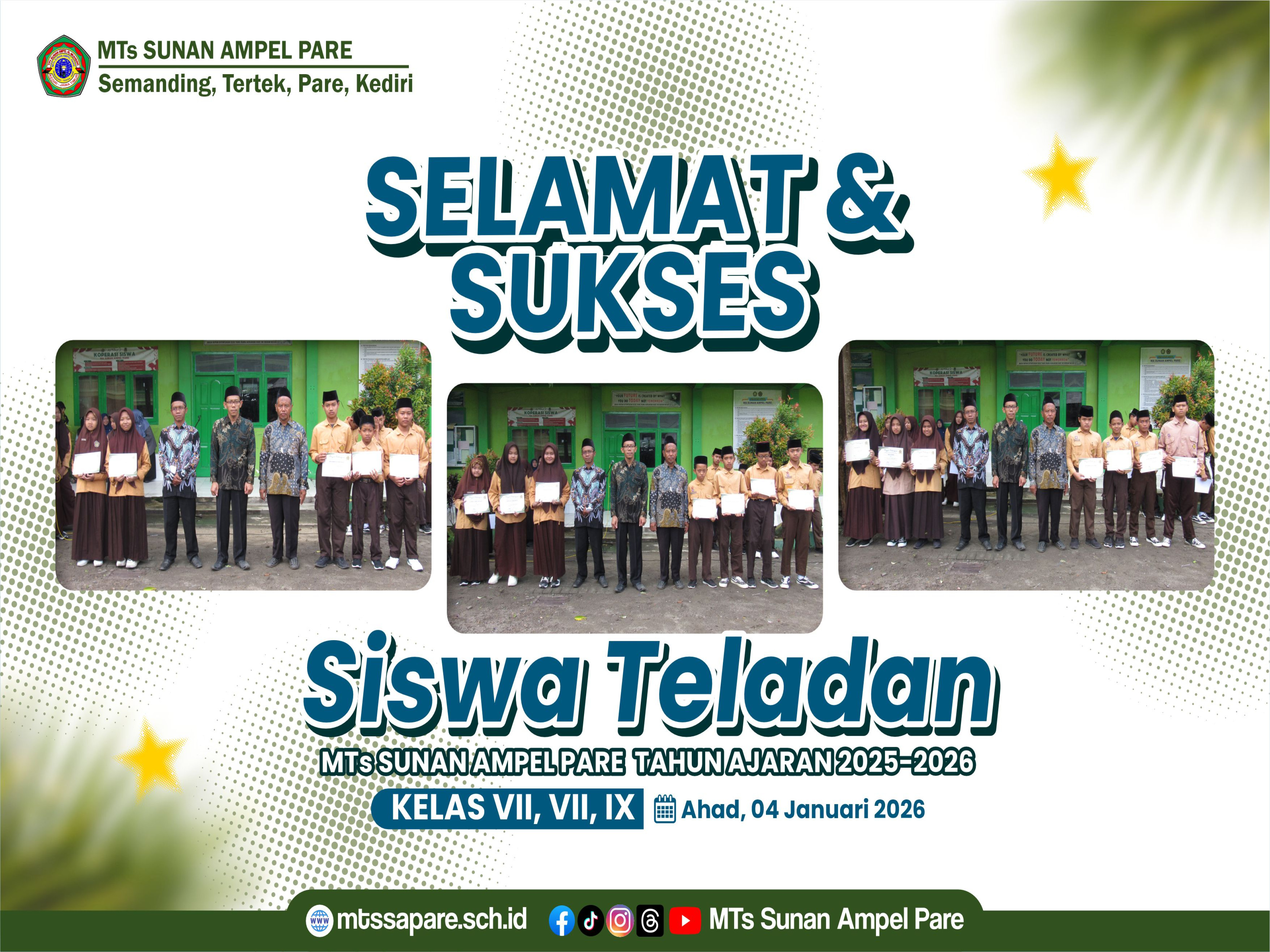 MTs Sunan Ampel Pare telah melaksanakan pemberian penghargaan kepada siswa-siswi teladan pada hari Minggu, 4 Januari 2026. Kegiatan ini merupakan bentuk apresiasi madrasah kepada peserta didik yang menunjukkan sikap disiplin, akhlak terpuji, serta keteladanan dalam proses pembelajaran dan kehidupan sehari-hari di lingkungan madrasah.